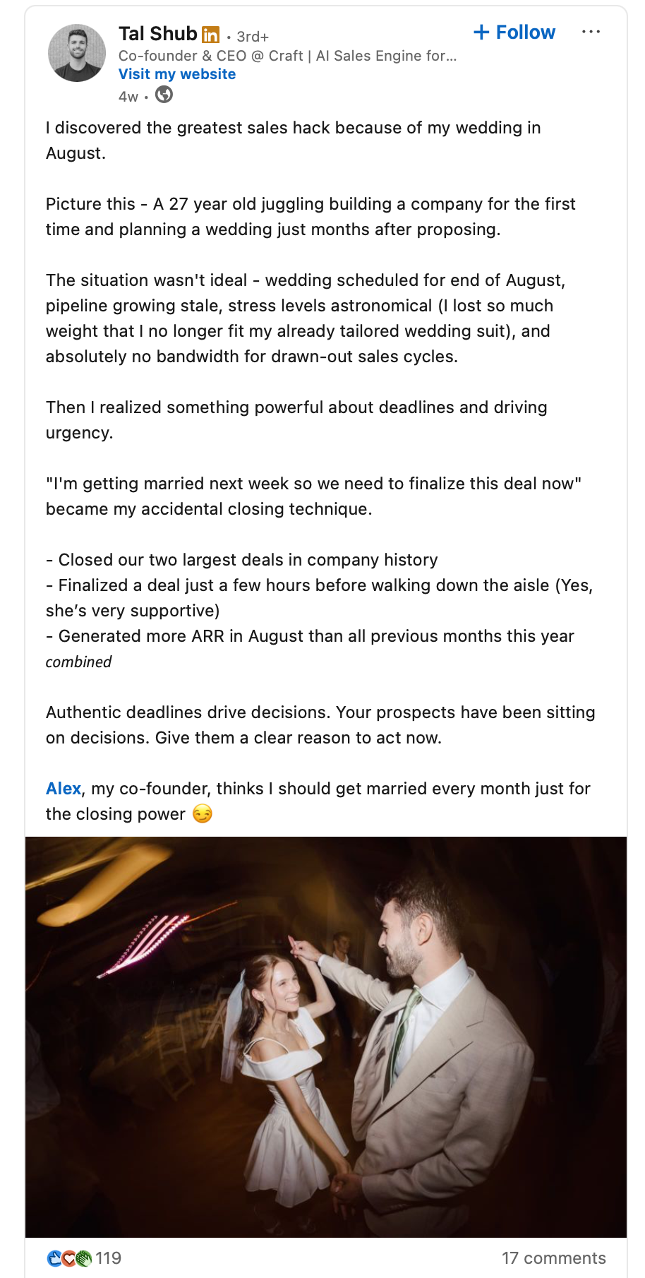 The last thing we want is even more people posting 'what my wedding taught me about how to close a deal.'